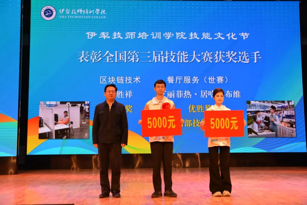 活动现场,2025年中华人民共和国第三届职业技能大赛获奖选手受到隆重表彰。在今年9月举办的中华人民共和国第三届职业技能大赛中,伊犁技师培训学院选派9名优秀选手,参加了餐厅服务、重型车辆维修、区块链技术、机电一体化、汽车技术、零售、车身修理、汽车喷漆等8个赛项的激烈角逐。其中,餐厅服务赛项选手艾丽菲热·居哈力布维荣获优胜奖,并斩获“西部技能之星”称号,成功入选该项目国家集训队;重型车辆维修赛项选手艾布都瓦力·吾山江荣获优胜奖,并成功入选该项目国家集训队;区块链技术、机电一体化、汽车技术三个赛项的选手均荣获优胜奖。获奖选手代表艾力菲热·居哈力布维与指导教师代表郭天旭分别进行了发言,分享成长心得与育人经验。