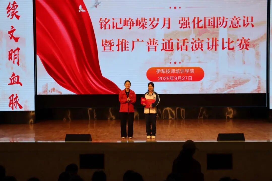 为深切缅怀“九一八”事变中牺牲的先烈与同胞,铭记中华民族的苦难与抗争历史,深入推进全民国防教育和爱国主义教育,同时贯彻落实国家通用语言文字推广工作,伊犁技师培训学院于2025年9月27日在学术报告厅隆重举办了“铭记峥嵘岁月 强化国防意识暨推广普通话”主题演讲比赛。